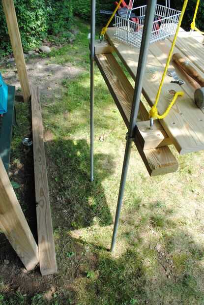 En este punto usted podría hacerse y sólo tiene que añadir un cubo de la polea. Por supuesto no era lo suficientemente bueno. Construir una plataforma con tablones 2x4s y cubierta. A continuación, añadir a guías por lo que la plataforma no gira cuando usted subir o baja la plataforma. Las guías son 10 pies 1/2 galvanizado tubos montados en la baranda de la cubierta. La plataforma se une a las guías con abrazaderas para tubos de 3/4.