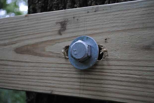Montaje 2 x 6 PT rayo al árbol.  Uso 8 largo 3/4 in de diámetro galvanizado retraso tornillo (gracias nuez Co., en Derby, CT) y garantizar al árbol.  Observe el corte oval en la madera.  Esto se hizo para permitir el movimiento del árbol.