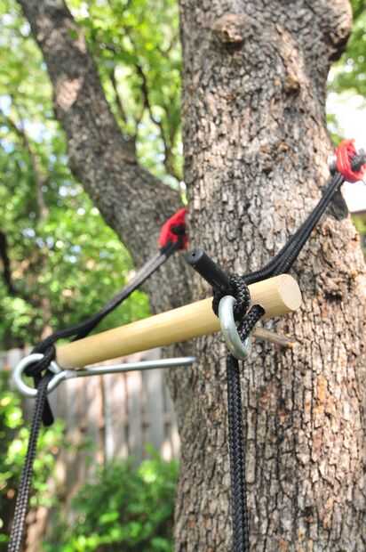 Dos pies por encima del capullo estar altura, instalar un par de tornillos de ojo en uno de los árboles. Los tornillos de ojo se necesitan para proporcionar el espacio entre el árbol y los pasos de la escala. El ojo tornillos deben nivelarse y 16" aparte de unos a otros (paso ancho).