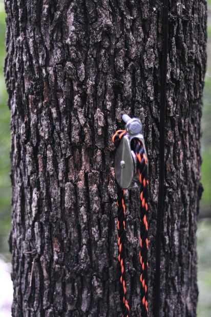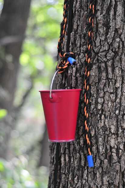 Subir una escalera de cuerda requiere ambas manos. Por lo tanto, es difícil de traer hasta el capullo. Para resolver este problema, instalamos un sistema de polea y cubo, que utilizamos para llevar libros y otros objetos hacia arriba y hacia abajo.