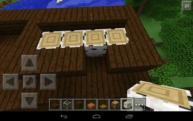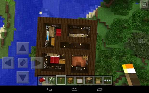 Para el baño, la puerta en medio de los tres bloques y contra la pared del fregadero con las fotos. El fregadero es naranja madera lo que se muestra en tres cuadros, cada uno en una etapa diferente. Luego, en una esquina arriba pone la trampilla como la ducha. Colocar la puerta. En el comedor, coloque cuatro bloques de madera oscuras al lado de uno contra la pared. Poner una losa de madera oscura en cada uno de los bloques al lado de las losas en bloques, poner cuatro troncos de abedul al lado del otro como se muestra. Crear la puerta y colocar la puerta. En las habitaciones, poner unas cuantas fotos, estantes, baúles, antorchas y dos camas en cada habitación. Construir las paredes en conjunto de 4 bloques de alto.