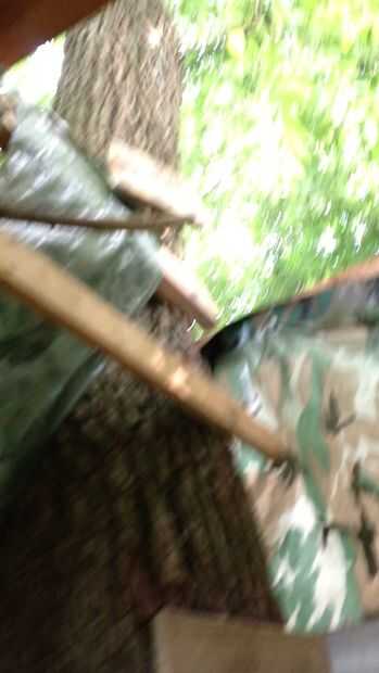 Después de tener la planta baja hace una semana decidí que quería un techo segundo piso. Usé tres vigas gruesas, robustas y clavado a los troncos para crear un marco para el segundo piso. Mantuvo nivel uno al otro para que el piso sea nivel. Entonces usé grandes, gruesas vigas y tablas para crear el segundo piso por colocación a través de las vigas de apoyo y luego los clavos hacia abajo. También he añadido algunas vigas de soporte debajo del segundo piso para mayor tranquilidad de la mente. También necesitaba una manera de levantarse al segundo piso, así que dejé una abertura anterior y agregados peldaños como los utilizados para levantarse en la casa del árbol.