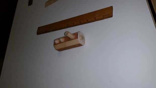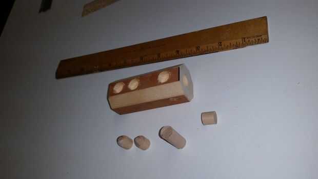 Marque los agujeros en la caldera, perfore los agujeros 1/2" diámetro x 1/2" de profundidad para el faro, chimenea, silbato y relleno. Luego se corta la caldera a la longitud. Corte un pedazo corto de 1/2" espiga el faro, uno más largo para la chimenea. Ronda final de la espiga y corte a aproximadamente 1" para el silbido y relleno.