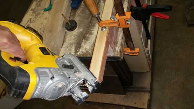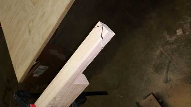 B. abrazadera 2 x 4 con la parte inferior del tren arriba. Dibujar un punto en 2 x 4 desde el centro al final en 45 º a ambas direcciones. Ajuste la sierra caladora a 45 º y corte el punto.
