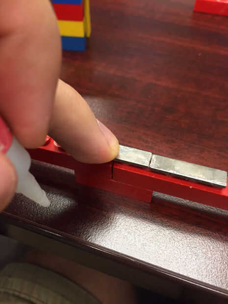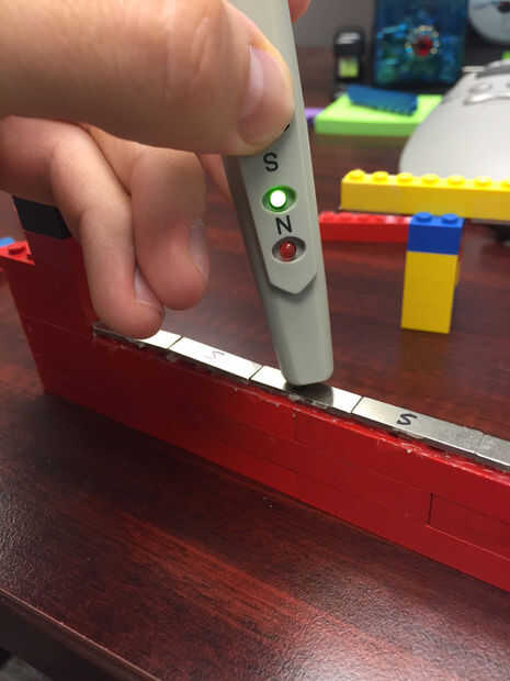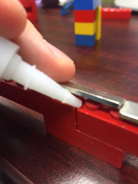 Una vez que decidimos ir con nuestra pista simple, nosotros simplemente pegados los imanes de BX041 a la parte superior de lo Lego.