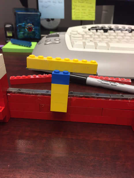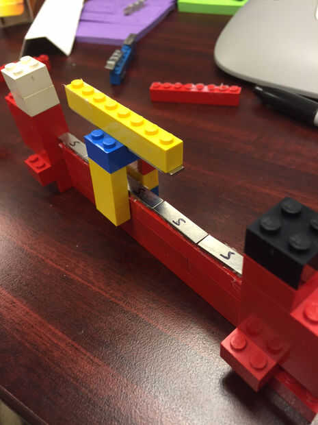 Nuestra estabilidad vino en la forma de adición de Lego debajo del tren. Estas piernas abrazan la pista muy de cerca, pero no toquen la pista. Esto aumenta la estabilidad de un lado a otro. Con dos imanes a ambos lados de la pieza larga agrega adelante de estabilidad hacia atrás. Ahora tenemos un establo levitando tren!