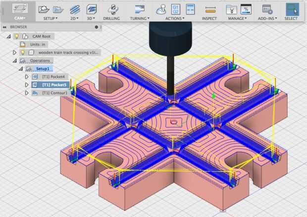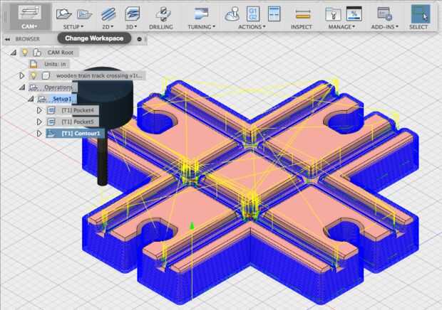 Usé el espacio de trabajo de CAM en fusión para generar trayectorias de herramienta para cortar el paso de x en el Othermill.