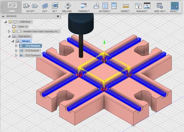 He creado tres trayectorias de herramienta para el uso con un molino de punta plana de 1/8 '': dos bolsillos y un contorno. He encontrado una pieza de contrachapado que era aproximadamente el mismo grosor que las vías del tren, que guardan una amplia operación de revestimiento. Se adjuntan los archivos .nc. Estas sólo son especialmente útiles si tiene la exacta misma máquina, herramienta y material, pero puede ser generalmente útil si tienes curiosidad acerca de las trayectorias de herramienta para la Othermachine.