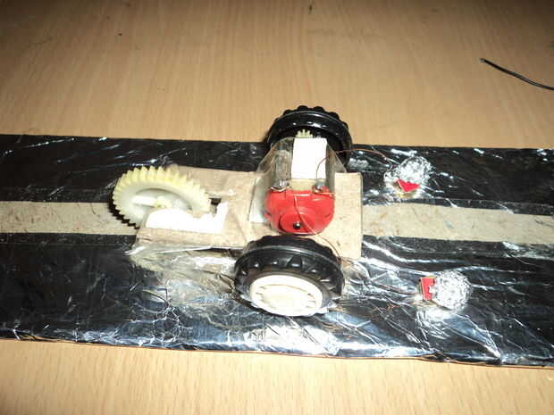 Este es un coche fácil que funciona en principio similar al eléctrico tren no llevan fuente con nosotros, pero mantenga la fuente estacionaria esto es igual como tren eléctrico, única diferencia es que en tren de paso de la corriente por encima de ella y en este el flujo de corriente es inferior a conectado al motor mediante pernos y cables que se mueven en coche tocando con papel de aluminio pasando actual esto pueden ser utilizados para varios propósitos como mesa de comedor para llevar alimentos a , como juguete para los niños etc.