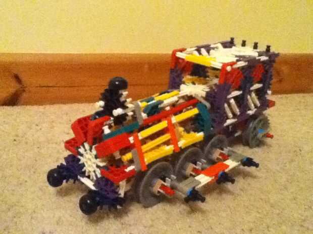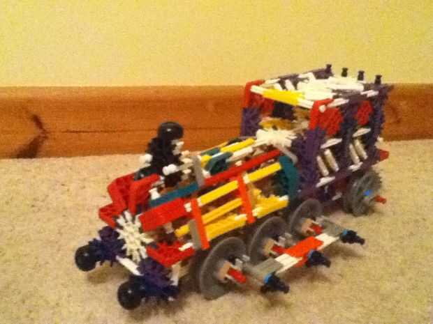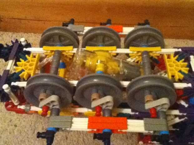 aquí es mi Instructable quinto! Mi nuevo tren parece realista, es fuerte, compacto y tiene un motor. La unidad es de un tren de locomotora de vapor típica en la década de 1900, y el motor está utilizando transmisión directa. Esto da a las ruedas delanteras tres una buena cantidad de esfuerzo de torsión, pero no muy rápido. Hay un pequeño conector en la parte posterior para personas que desean agregar carros, etc.. Una pista puede hacerse fácilmente con exceso K'NEX, aunque no tengo las piezas para hacerlo. Espero que disfruten, buena suerte :)
