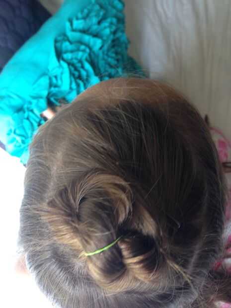 Paso una parte de su cabello en cualquier lado y hacia fuera de un cuadrado de pelo (lo siento que se ve tan mal)