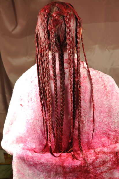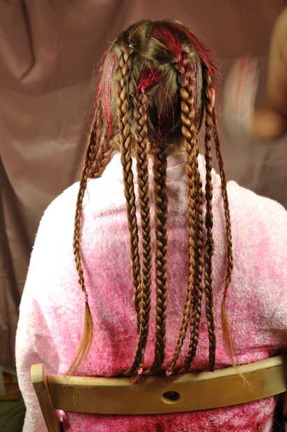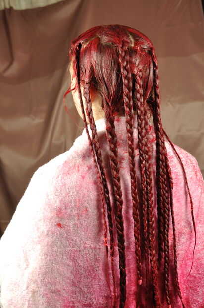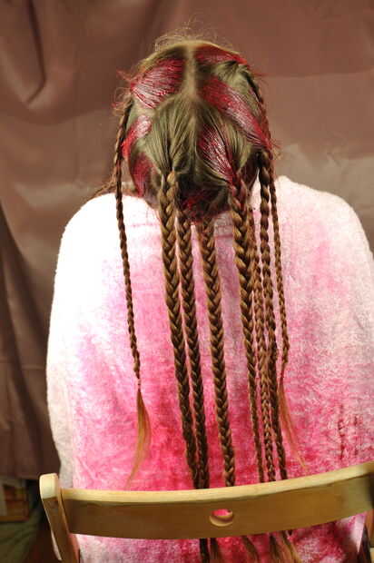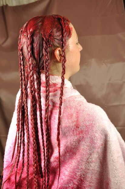 Ahora, con las manos enguantadas, teñir todas las trenzas, frente y parte posterior. Saturar los mejor que puedas. Si usted tiene un tinte más liquidez, cuidadosamente rocíe sobre las trenzas mientras ahuecando su mano debajo de él y frotar.