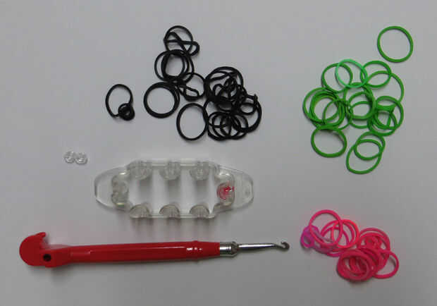 Utilizo 3 colores (rosa, verdes y negro). Puede utilizar cualquier color que desee. Para cada color uso 18 bandas de goma.