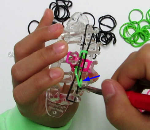 poner una banda de caucho roja diagonal a su derecha e izquierda como se muestra en la imagen.Paso 1: Poner una goma roja y diagonalmente a la derecha e izquierda como se muestra en la imagen.Paso 2: Poner una goma turquesa en el delantero izquierdo.