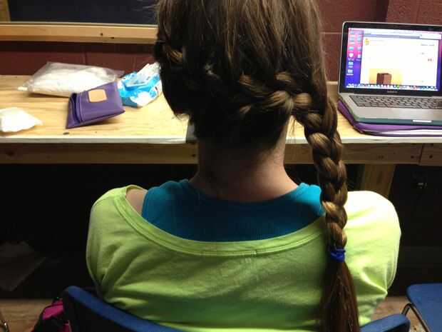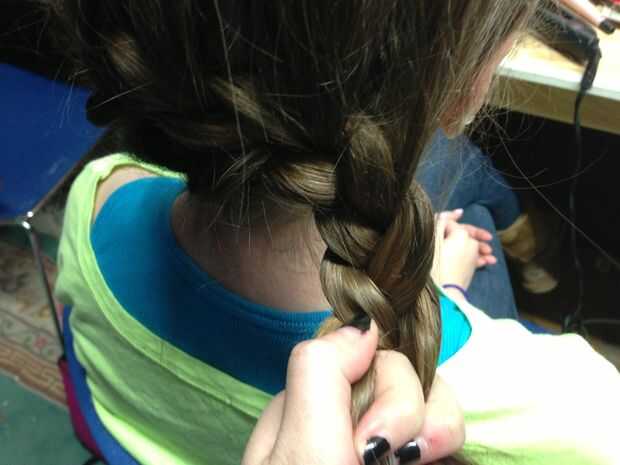 Con el pelo de la trenza, hacer una trenza regular (como en el paso uno) hacia abajo y atar en un lazo del pelo.