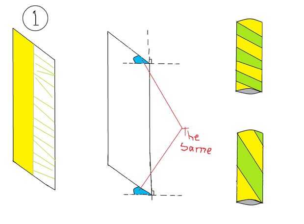 Queremos que nuestra bufanda, antes de que es cosido en un tubo, para parecerse a (1). Observe la parte superior inclinada: el ángulo controla cómo 'torcido' será su bufanda. La más inclinada (más cercano a la vertical) este ángulo es, más marcado el giro. Esto significa que usted necesitará un pedazo más largo de la tela antes de coser en un tubo.