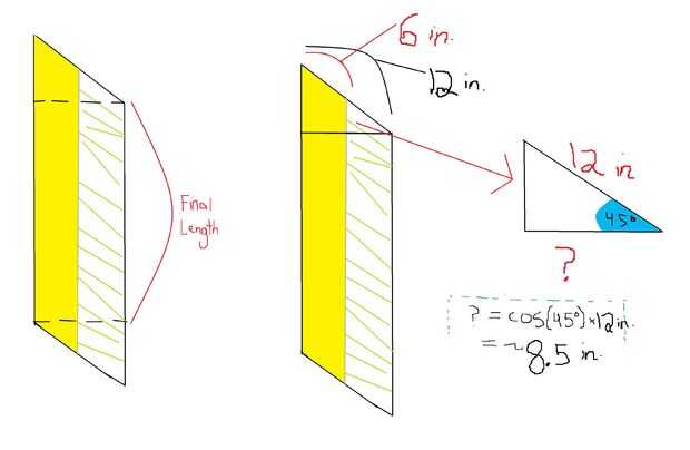Usando un poco trigonometría handy dandy, sabemos que el ancho es el coseno del ángulo, multiplicado por la longitud de la parte superior inclinada. En mi caso, tener una inclinación de 45 grados y con ganas de una bufanda de 6 pulgadas de ancho (con la cima inclinada 12 pulgadas), utilizaría: