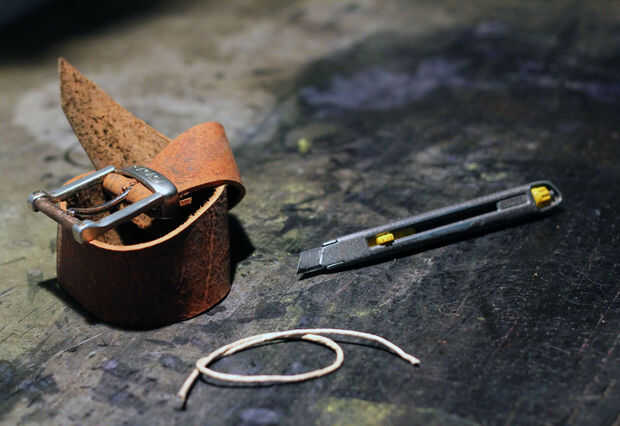 Un cinturón viejo de cuero, un cuchillo y un trozo pequeño de cuerda.