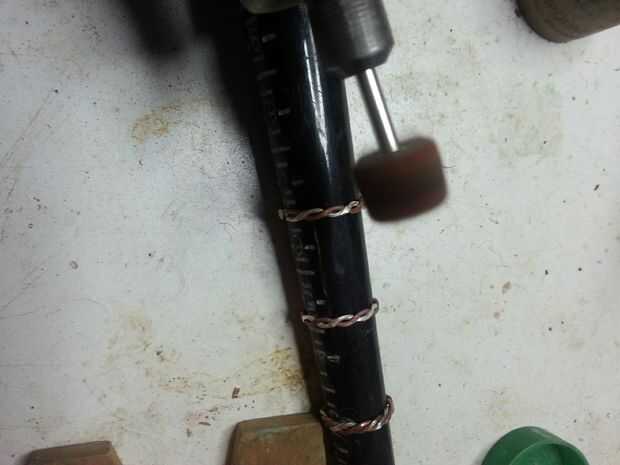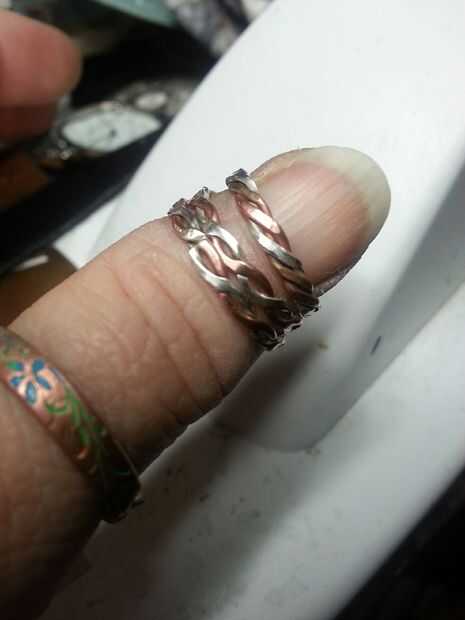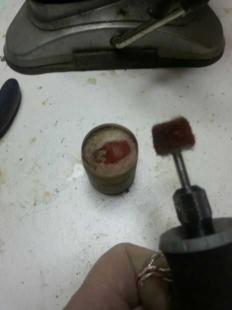 Carga de la rueda girando el Dremel a su posición más baja y ejecuta en el rouge. La rueda se vuelve roja. Me gusta dejar los anillos en el palo del ring para pulir la parte de afuera. Sólo asegúrese de anclaje con el pulgar o girará. Asegúrese de pulir también el interior.