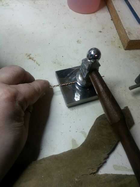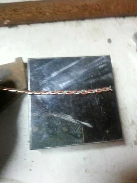 Coloque el cable en una placa de acero o yunque y un martillo plano. Es una gran manera de elaborar algunas frustraciones. Me torcí 2 bandas. Uno es plata y cobre y plata, cobre y latón.