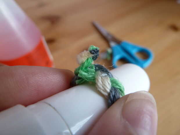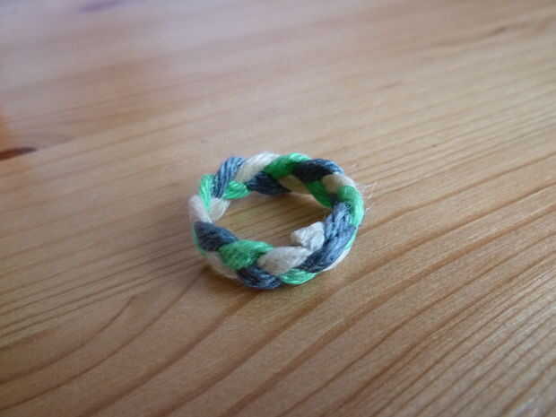 Ahora es el momento para hacer un anillo. Envolver el trozo de trenza simplemente cortar alrededor del objeto redondo y pegar la pieza superpuesta en el anillo. Deje que el resto de pegamento hasta que esté casi seca. Coger con cuidado el anillo del objeto redondo. Como se puede ver, todavía hay un pequeño espacio entre la parte superpuesta y el anillo. Añadir un poco de pegamento y presiona la parte solapada contra el anillo.