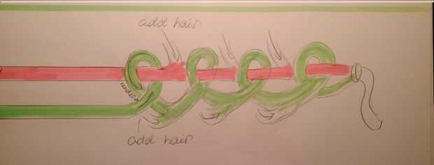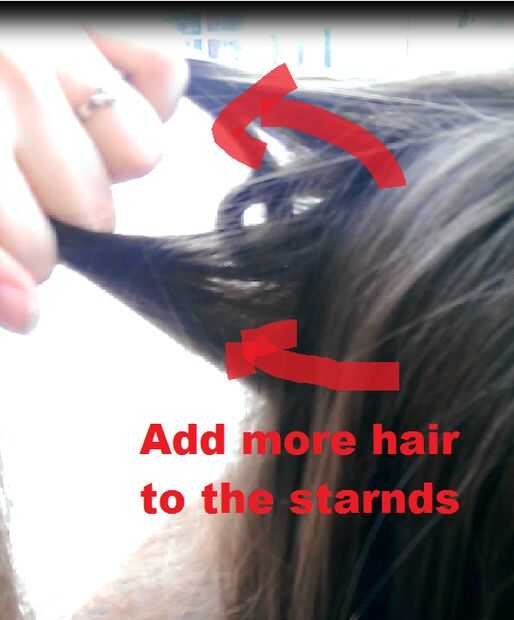 2. Añadir más pelo a cada una de las hebras y hacer otro nudo