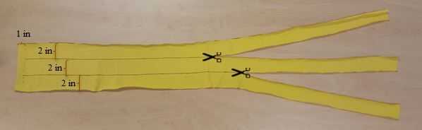 • ** Ahora trabajarás con una tira de 6 pulgadas en los pasos siguientes ** Divide la franja de 6 pulgadas en tres tiras más pequeñas (2 pulgadas). Dejar un borde de 1 pulgada en un extremo y cortar el resto.