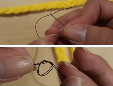 • Cuando se tiene cerca de 4 pulgadas de hilo de la costura a la izquierda debe anudada. Para crear un nudo, inserte la aguja a través de una pequeña porción de la trenza (izquierda), pero no tire de la aguja lo suficiente como para apretar la costura. Antes de que la costura está completamente apretada, un lazo se forma (derecha). Introduzca la aguja en el lazo, luego tirar y apretar.