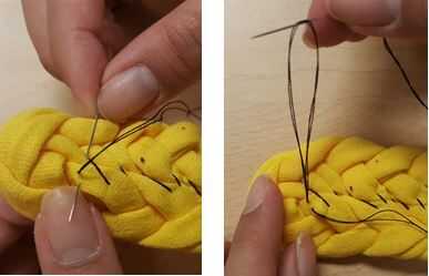 • Comience introduciendo la aguja en el borde de una trenza a través y hacia fuera del borde de la segunda trenza. Sacar la aguja para fijar la costura. Continúe haciendo esto hasta que te queda cerca de 4 pulgadas de hilo.