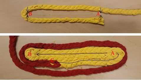 • El óvalo en forma de alfombra debe ser cosido como se muestra. Comenzar en el punto A y cosa hasta el punto B. La cosa siguiente debe ser desde el punto A hacia el punto C y en adelante, envolver la trenza alrededor de y alrededor hasta que utilizar todas sus piezas trenzadas. **Las clavijas son sólo para mostrar cómo la alfombra debe ser cosida. La alfombra no debe tener pernos en él durante la costura. **