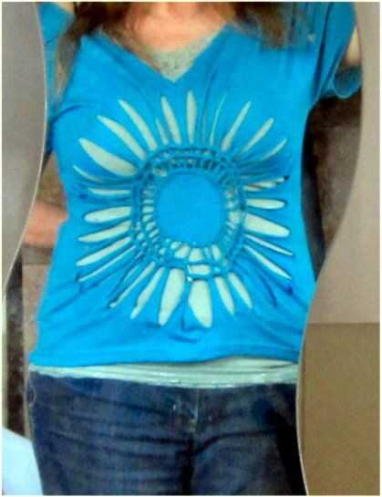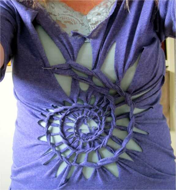 Básicamente puede rebana una camiseta en cintas y luego tejerlo estratégicamente detrás juntos.
