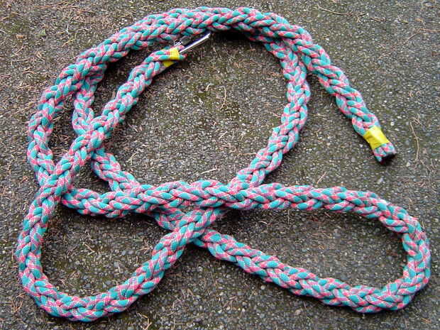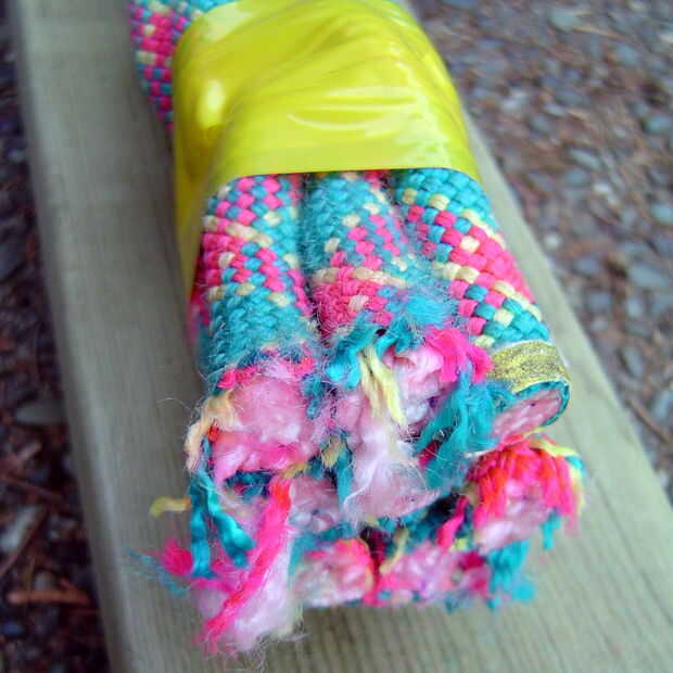 Cuando te quedas sin cuerda, con cinta el extremo y cortar con una cuchilla muy afilada. Funden los extremos de la cuerda y listo. Nuestro "acero rápido" es 40 mm (1.5") de espesor y 5 m de largo - no mucho para salir de un helicóptero, pero buena diversión para los niños en el patio trasero...