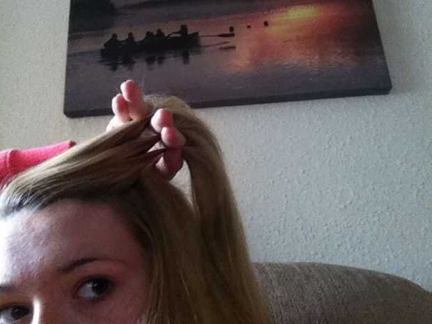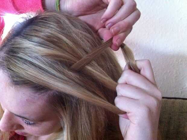 Inicio en el tamaño izquierdo de su cabeza, tome una pequeña sección de cabello. Comience por hacer una puntada de trenza normal 3 cordones Asegúrese de empezar por pasar debajo de entonces.