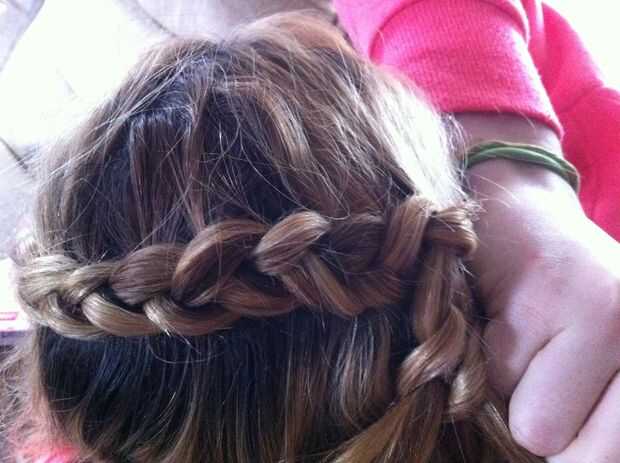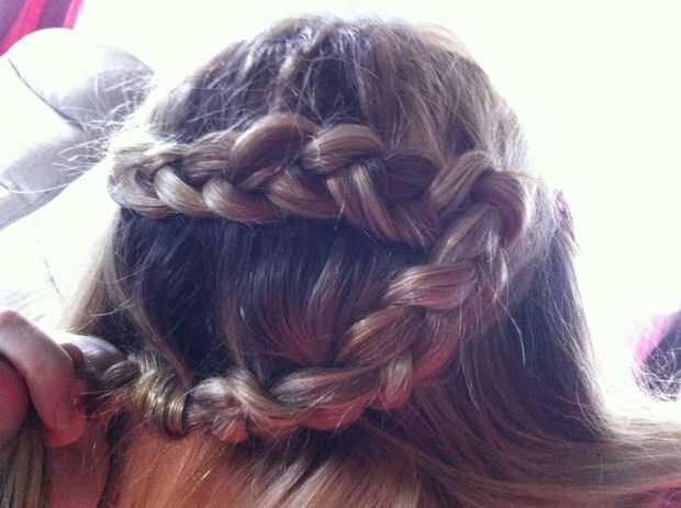 La trenza alrededor de la curva y comenzar a añadir secciones de cabello a la hebra superior. Debe ser lo que hubiera sido el fondo si había llevado a cabo.
