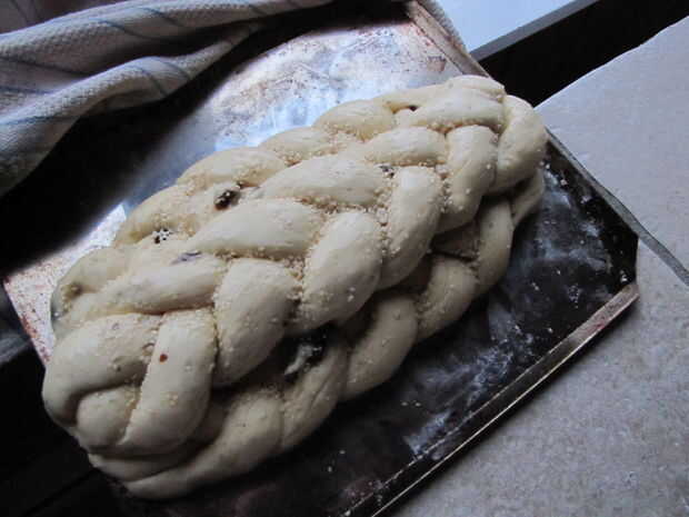 Junte dos trenzas en una placa para horno espolvoreada con harina y colocar la tercera trenza en la parte superior de centro de las otros dos trenzas.