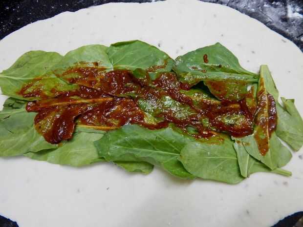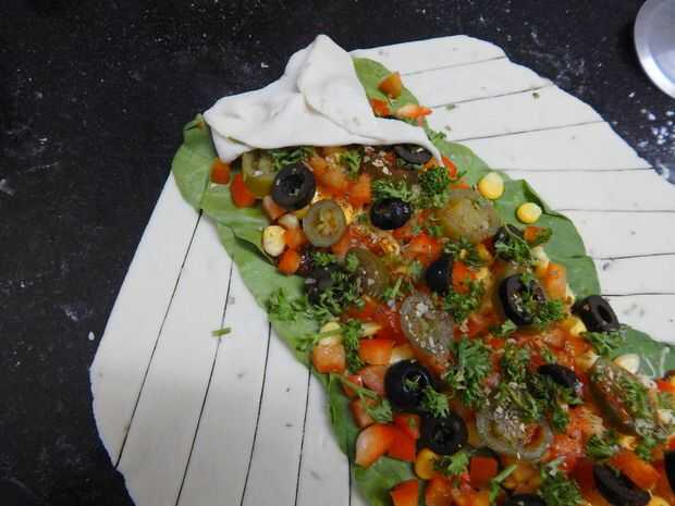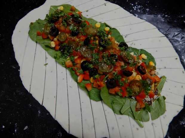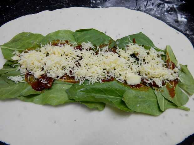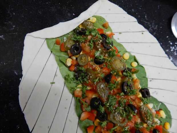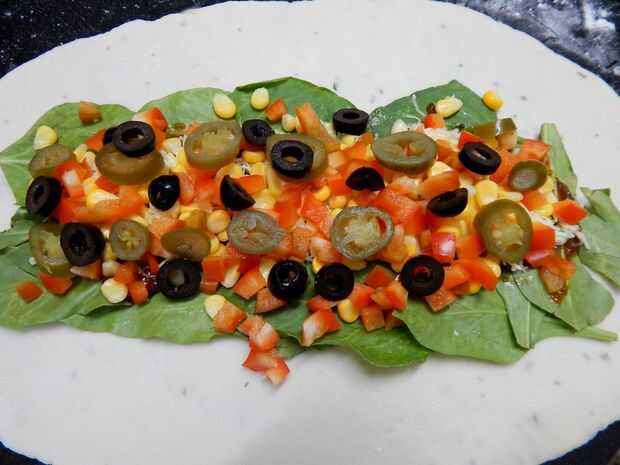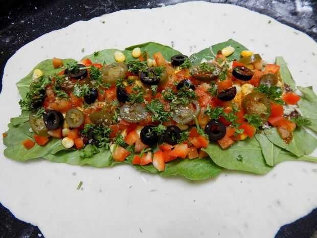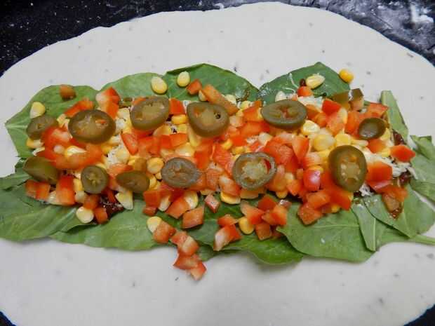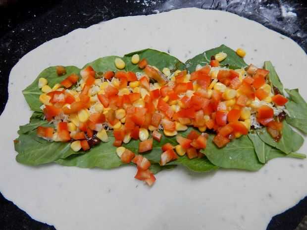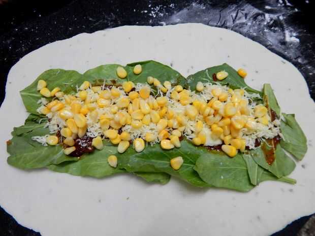 Relleno que estamos utilizando es básicamente la de una pizza! podemos hacer calzone por cualquier relleno queremos montarlo tan añadiendo espinacas poco todo. razón que lo hago es que cuando lo cocinamos, el queso permanece contenido dentro de las hojas de la espinaca y no derrama hacia fuera! Difundir la salsa de pizza y agregar el queso! Luego añadir otras verduras de su elección, y tanto como te gusta,, añadí maíz, pimiento rojo, jalapeños, aceitunas, espolvorear perejil, poco de copos de guindilla, sal y orégano. luego cortar la masa de pizza poco rayas en los lados, ligeramente inclinados hacia abajo usando un cortador de pizza!