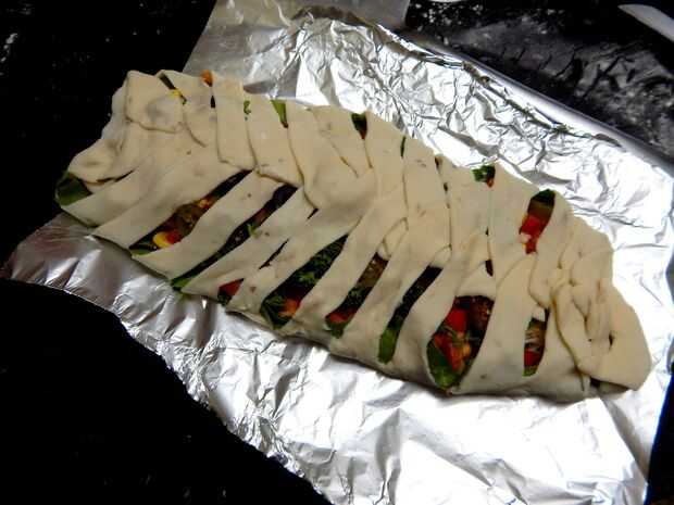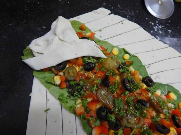 Ahora su muy simple, doble la solapa superior (ver foto), tomar los extremos, doblar hacia adentro luego pliegan otro extremo y continuar haciendo esto hasta terminar con todas las rayas que tienes! se puede aplicar agua para pegar la porción traslapada de stripes(optional)! Una vez que su hecho, pincelar con leche y hornear en horno precalentado a 200 c durante 20 minutos o hasta hacer! Después de su hecho, solo cepille con mantequilla para el glaseado y encantador aroma!