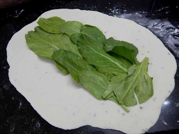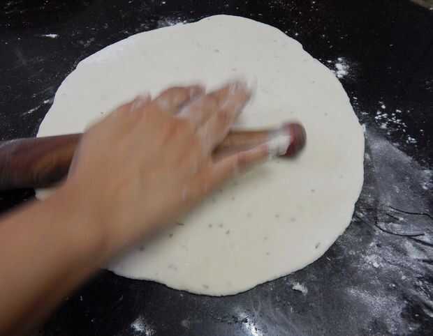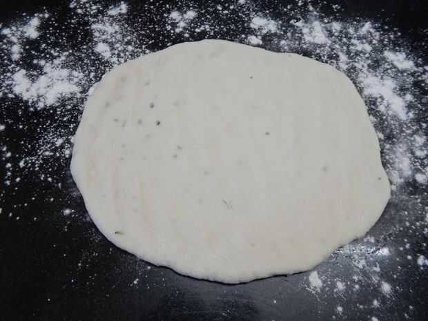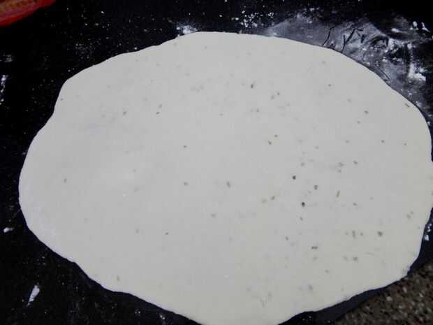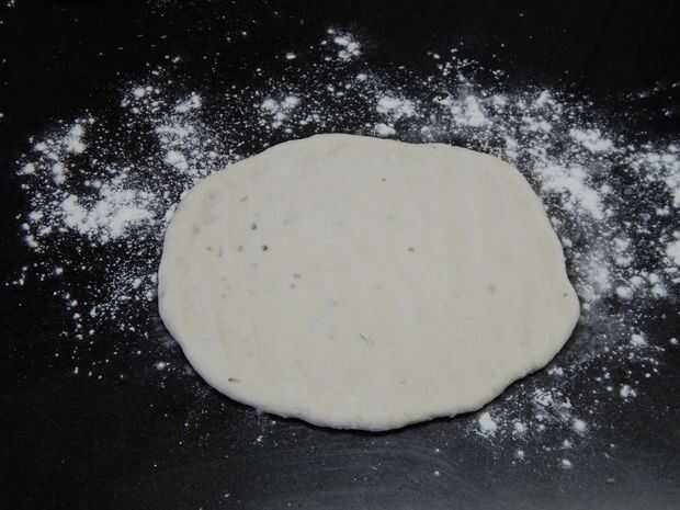 Toma una hoja de silicona hoja papel, espolvorear con harina all purose y rodar muy lentamente en una forma rectangular u ovalada! (Me olvidé de rodillo sobre un silpat / papel de aluminio así que tuvo que transferir el calzone lista para cocer en uno y créeme que era una tediosa tarea!)
