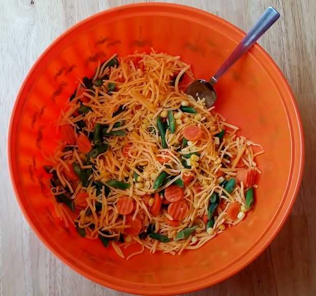 a. combinar los vegetales congelados y queso cheddar en tazón grande.
