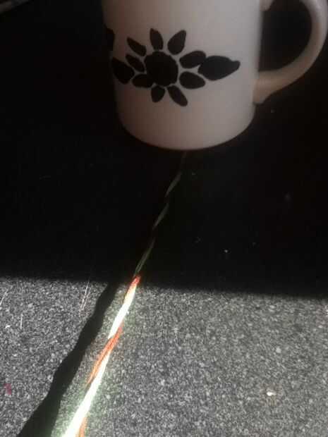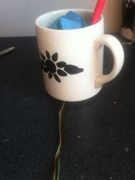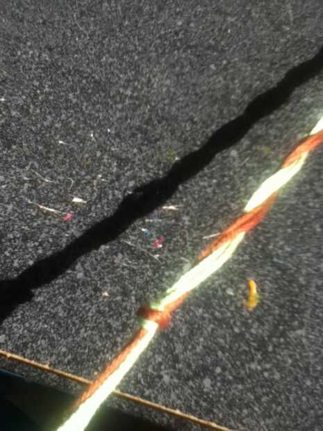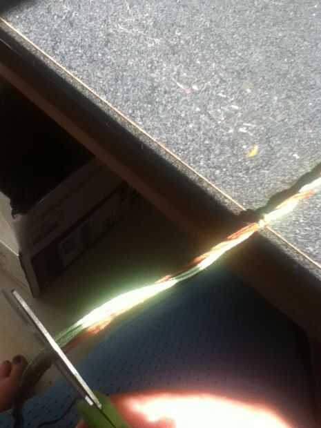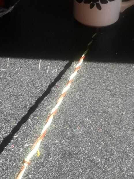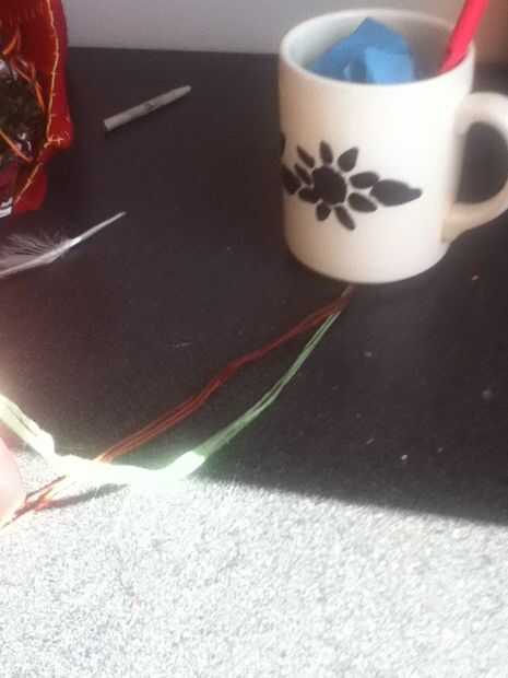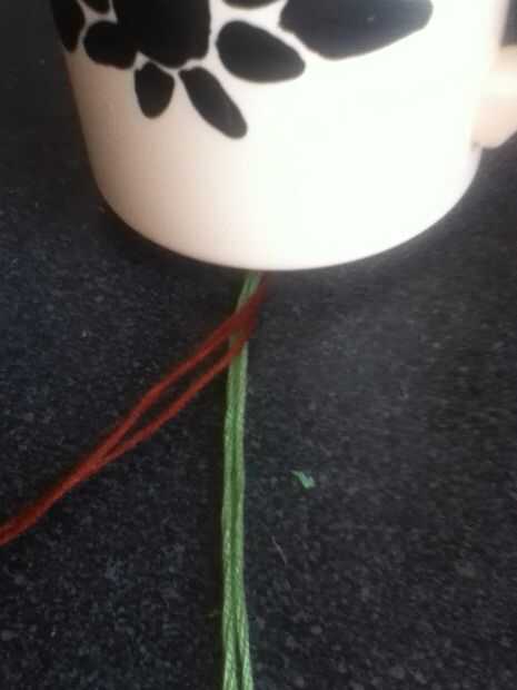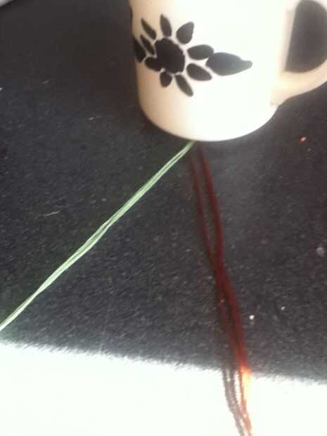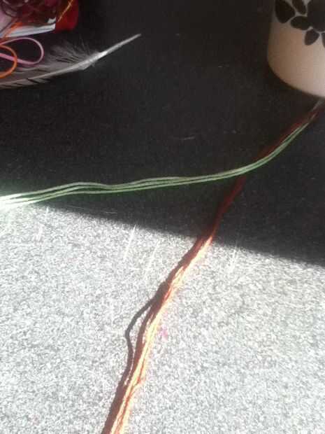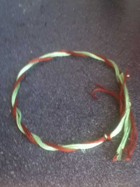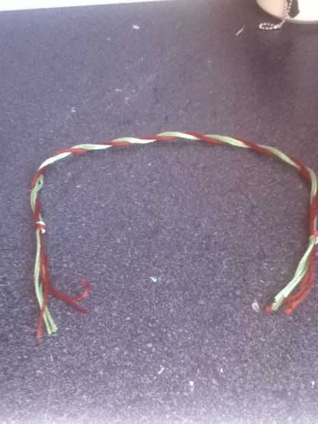 Cinta abajo o poner algo pesado sobre ella. Separar los colores. Poner un color sobre el otro. Repita hasta que todos torcidos. Corte hilo extra y tienes una pulsera trenzada!