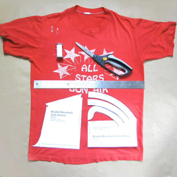 Comience con una camiseta sin costuras laterales. La impresión es aceptable, siempre y cuando no hacer la tela rígida ni frunza. También revise la impresión de la apariencia en el interior de la tela (el tanque terminado es dado vuelta adentro hacia fuera) – algunos diseños demuestran para arriba a través de la tela. Camisetas viejas, Beat-up gran trabajan! algodón 100% funciona para este modelo, pero creo que a menudo una mezcla de algodón/polivinílico tiene un paño más agradable y es más resistente a desentrañar.