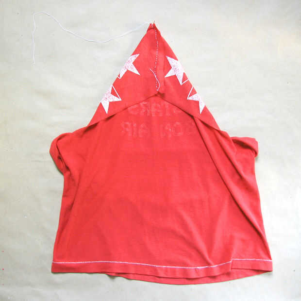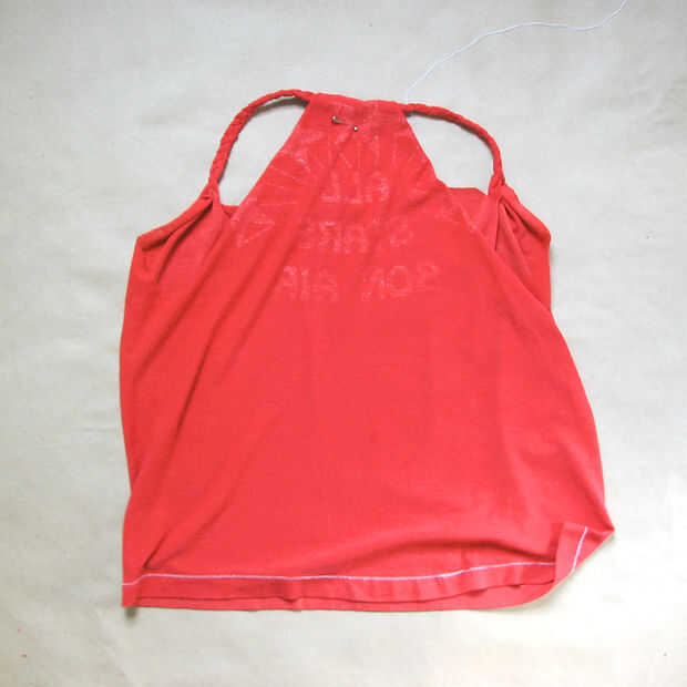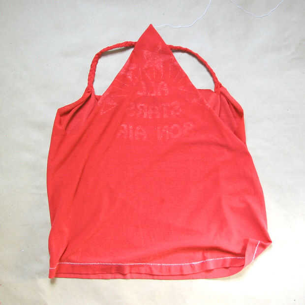 Gire la camisa adentro hacia afuera. (Cualquier impresión debe ser ahora en el interior de la camisa) Doblar los bordes superiores para conocerse en el centro. Ya sea a máquina o a mano coser una costura entre las ranuras. (Usted está simplemente cosiendo las dos aletas juntos, no de costura hacia la tela por debajo.) Si usted es coser a mano, comenzar en la parte inferior y no corte el hilo, simplemente deje el hilo colgando de la parte superior de la costura. Vuelva el triángulo que ahora la alineación es hacia el interior. Si se deja una cadena en el extremo de la costura, colócala en la parte superior del triángulo. Tire de la correa trenzada debajo del triángulo racerback. Doblar la punta del triángulo (alrededor de una pulgada) sobre la trenza para la correa. Perno en su lugar. Ahora probar la camisa. Ajustar el ajuste cambiando la cantidad del triángulo han doblado hacia abajo. Una vez que estés satisfecho con el ajuste, coser unas puntadas asegurar la parte superior del triángulo doblado a la guarnición.