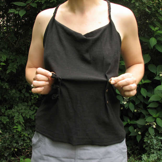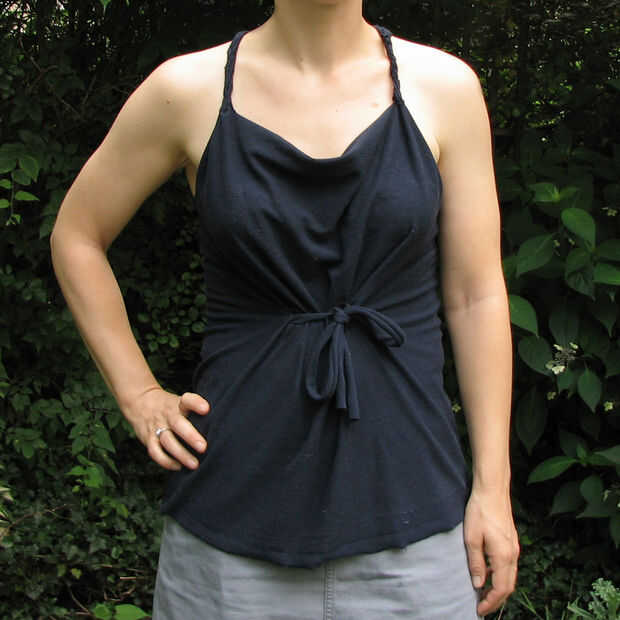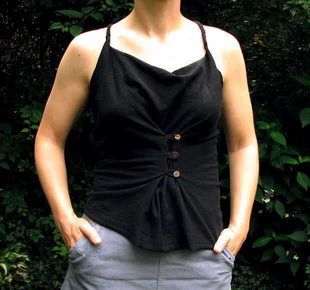 Ahora tienes una camisa totalmente terminada (fácil, correcto?) Hay un número de maneras que usted puede modificar el diseño básico. Obviamente pintura de tela y la muerte pueden darle resultados rápidas y audaces. También me gusta una camisa que tiene una definición un poco más. Es bastante fácil de jugar con la adición de pequeños dardos para cambiar la cortina de la camisa. Mi favoritos modificación es sólo tire de la tela sobrante y llevarlo adelante derecha junto alrededor de mi cintura natural y agregar un cierre o un lazo para sujetarlo. (Puede utilizar las tiras de las mangas para hacer un lazo que empareja).