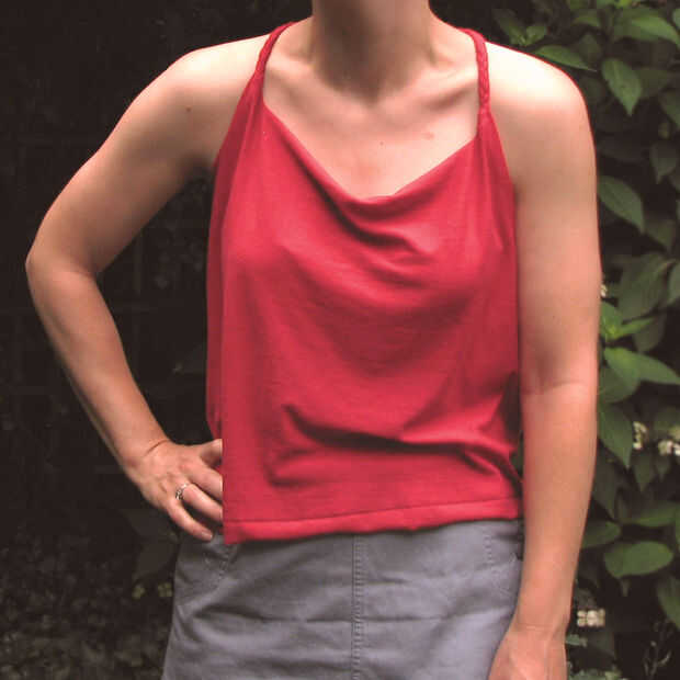 Este patrón definitivamente necesita ser dado vuelta adentro hacia fuera para trabajar (si no todos los bordes se encrespan exactamente al revés). Sin embargo, todavía puede usar una camiseta con las costuras laterales. Hacer el patrón especificado y coser luego nuevos costuras laterales, convirtiendo los antiguos en el interior. (Usted tendrá en su margen en el ancho total de la t para el tamaño). Si quiere coser las costuras laterales, añadiendo botones o un lazo en la parte delantera no funcionará. Pero usted siempre puede agregar algunos formar o pinzas para su nueva costura.