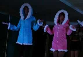 La piel de la burbuja ajuste se hace mediante la construcción de tubos largos de tela de polar blanco de relleno relleno de fibra. El tubo es entonces ceñido cada par de pulgadas con hilo y luego la mano cosida en el manto. Una cremallera larga separación entonces fue agregada para terminar el traje.