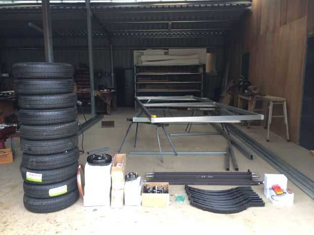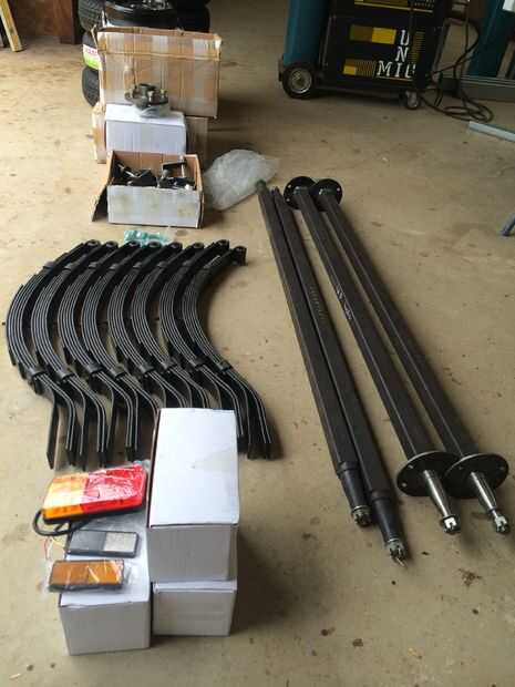 Trailer rodante fue seleccionada de un proveedor de piezas de remolque como un kit. Había un número de patrones de perno eje coincidencia común vehículos para elegir y tiene que especificar la longitud del eje requerida. También puede elegir entre cable, frenos hidráulicos o eléctricos. Frenos eléctricos necesitan un control instalado en el vehículo de remolque que puede ser un inconveniente y he tenido experiencia con frenos hidráulicos en el pasado y encontrado ok usé frenos hidráulicos. El tren para dos trailers se muestra en la primera foto como resortes, ejes, frenos y enganches. Las fotos de la segunda muestra también los neumáticos para los dos acoplados con los componentes.