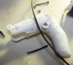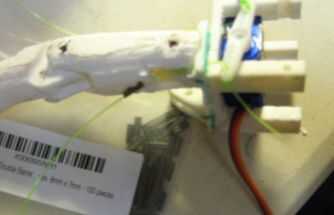 Tendón frontal-hilo anudado pescado línea de servo del brazo al frente finger2. Fije con barril doble (más fácil) o nudo. Tendón del trasero-agujero en la parte posterior de la finger2 y a través de la placa de montaje del motor, el tendón 2 (línea de pescado) de la parte posterior del brazo del servo a través de la bancada del hilo de rosca y asegure a la parte posterior de finger2. Asegúrelo en su lugar.