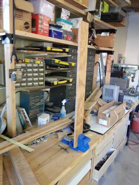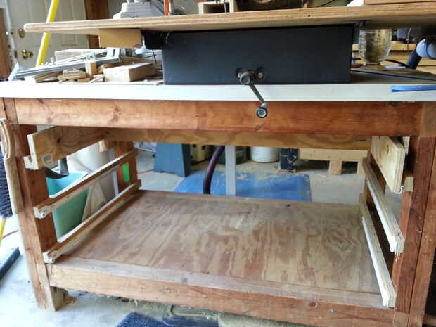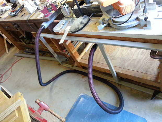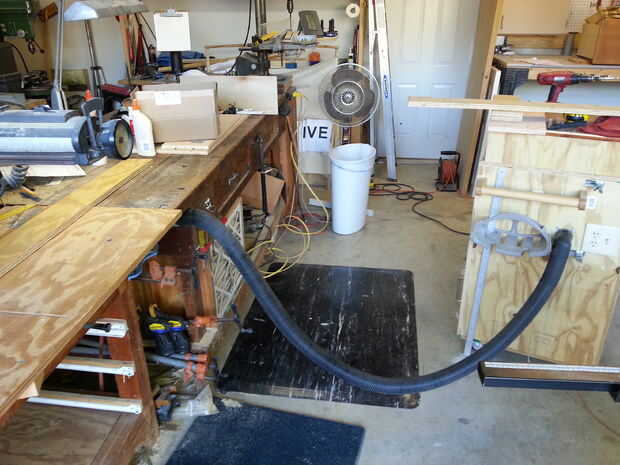 El cajón superior es menor en profundidad que los cajones inferiores, debido al polvo de tuberías de colección que me he encontrado en el brazo radial Sierra (esta voluntad) ser objeto de un futuro Instructable. Puedes ver las dos mangueras de vacío que están conectadas a la Sierra de brazo radial en un par de fotos - una manguera en la parte posterior - y otra manguera en la parte delantera que se conecta al carro tienda vac que se cubre en otra Instructable.