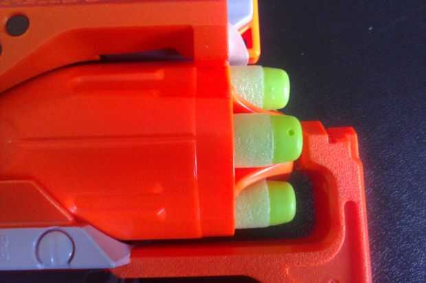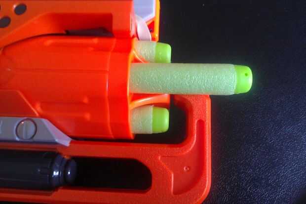 Para cargar los dardos correctamente, inserte los dardos de tal manera que el pequeño agujero en la parte superior de cada dardo es orientada hacia afuera, en un exacto enfrente de la dirección del centro del cañón.