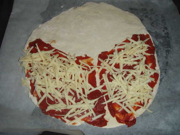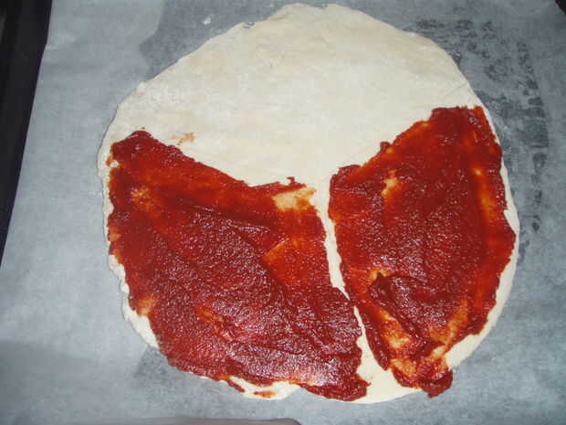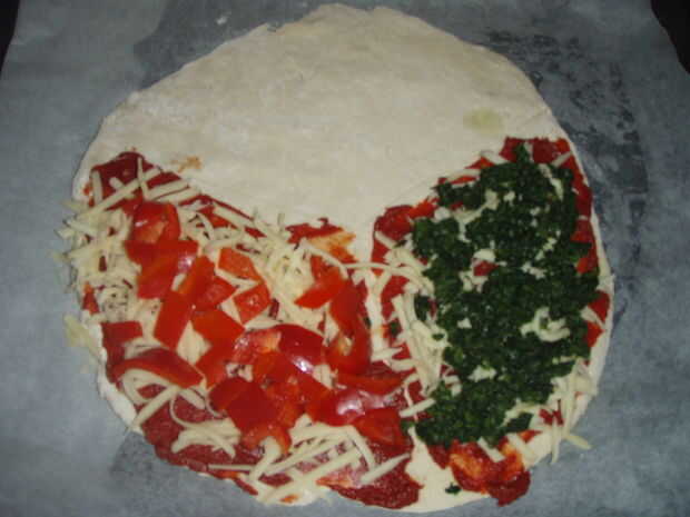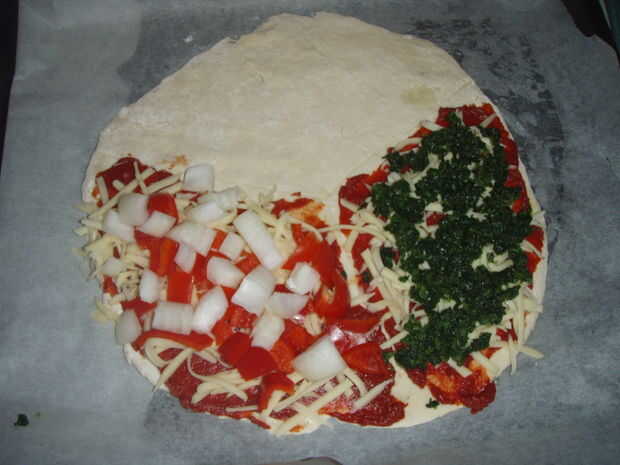 Aunque sólo hemos añadido coberturas a dos de las secciones, la pizza va a ir en el horno durante cinco minutos, como las coberturas para el arrancador y platos principales tardan más en cocinarse que los aderezos de curso de postre.
